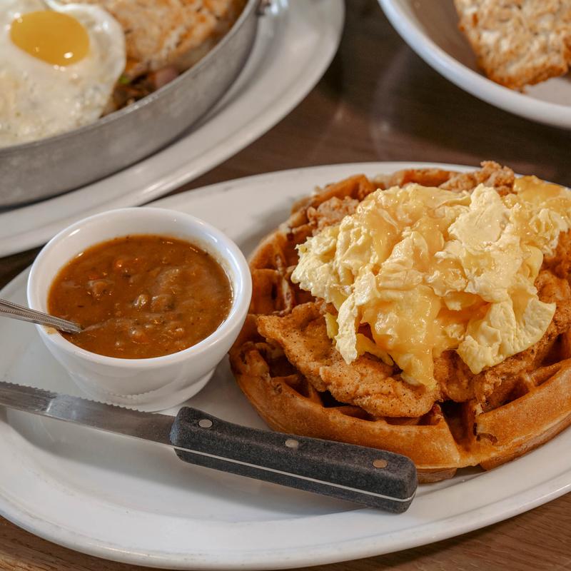Drop biscuits with hash browns, cheesy eggs, fried chicken, smoked bacon, pickled cherry peppers, caramelized onions, and sausage gravy.
