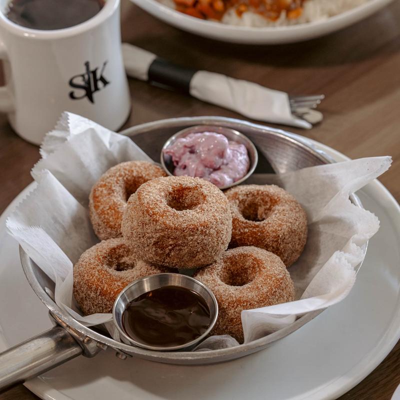 Fried biscuit donuts (bo-nuts), tossed in cinnamon sugar, served with blueberry mascarpone & chocolate syrup.