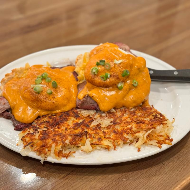 English muffin, topped with house-made corn beef hash (shredded corn beef, onion, green pepper & potato), poached eggs & hollandaise sauce.