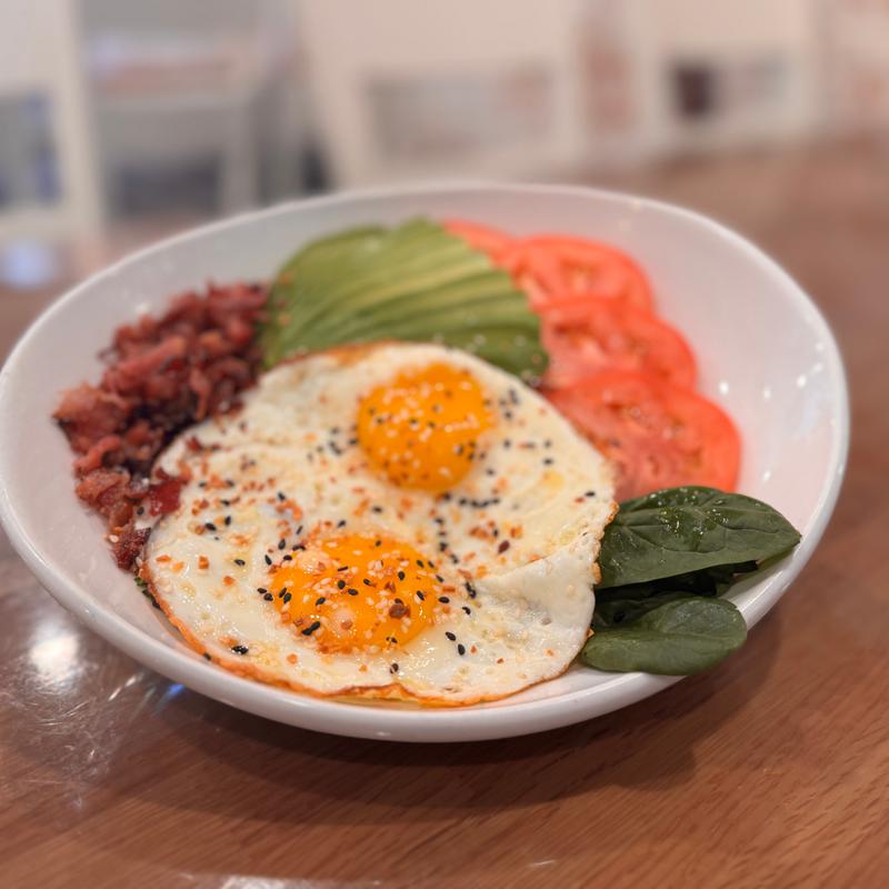 Brioche bread, creamy eggs, cheese, choice of bacon or sausage, topped with sriracha aioli & chives. Served with hashbrowns • Add Avocado.