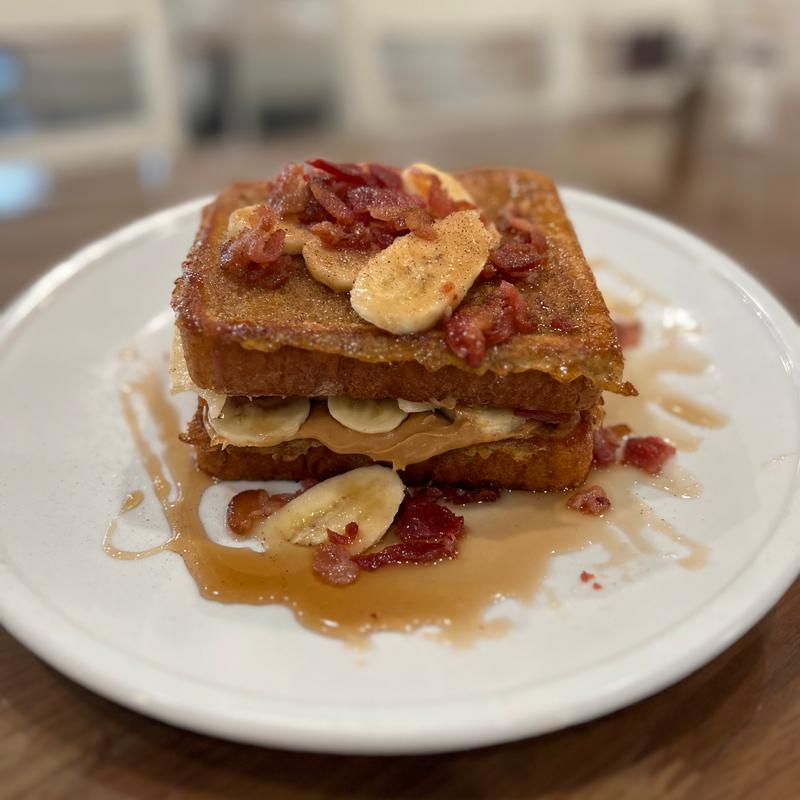 French toast stuffed with peanut butter, topped with bananas, bacon, maple syrup, and powdered sugar.