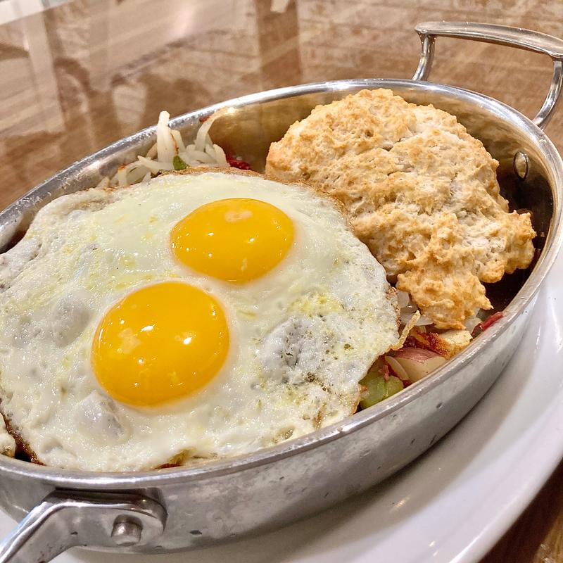 Skillets are all served with a complimentary biscuit, hash browns & two eggs any style, and toast or pancakes • Egg whites $2.00 | House hash browns $3.00 | Specialty cakes $4.00